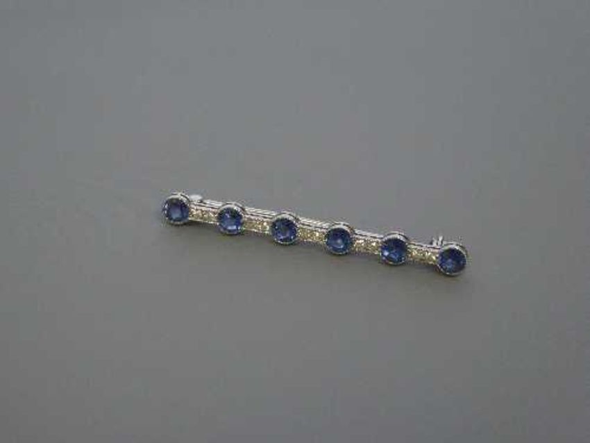 An early twentieth century six stone sapphire and diamond bar brooch, set in white gold, length 5 cm, 4.5g.