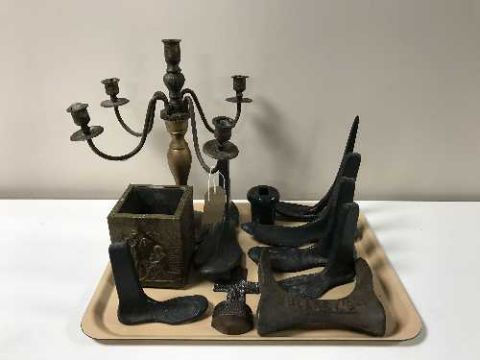 A tray containing metal five-way candelabra, small brass embossed pot, shoe lasts etc