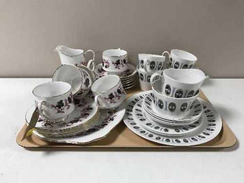 A tray containing a nineteen piece Paragon Michelle tea service together with a part Queen Anne tea service