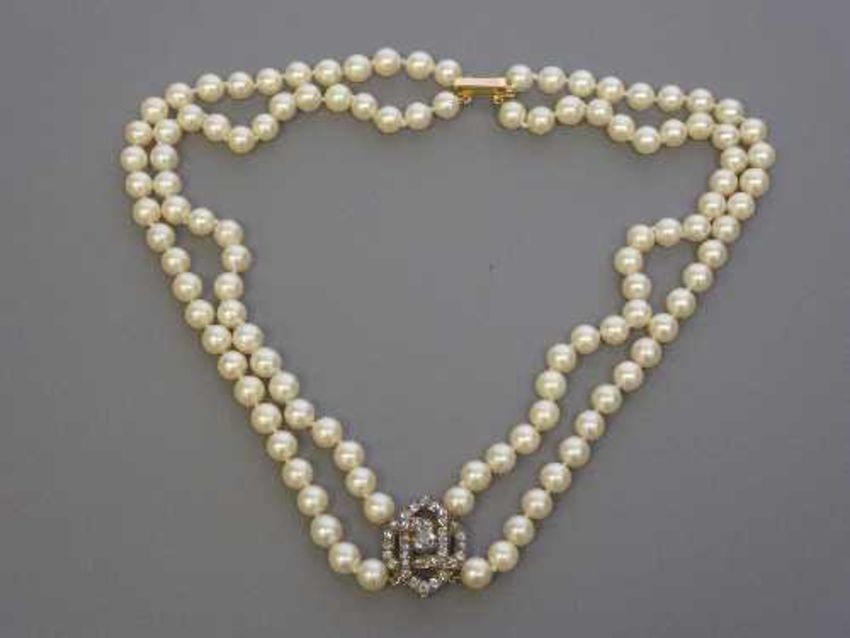A fine double strand pearl choker necklace with old cut diamond pendant and gold clasp, total length 43 cm.