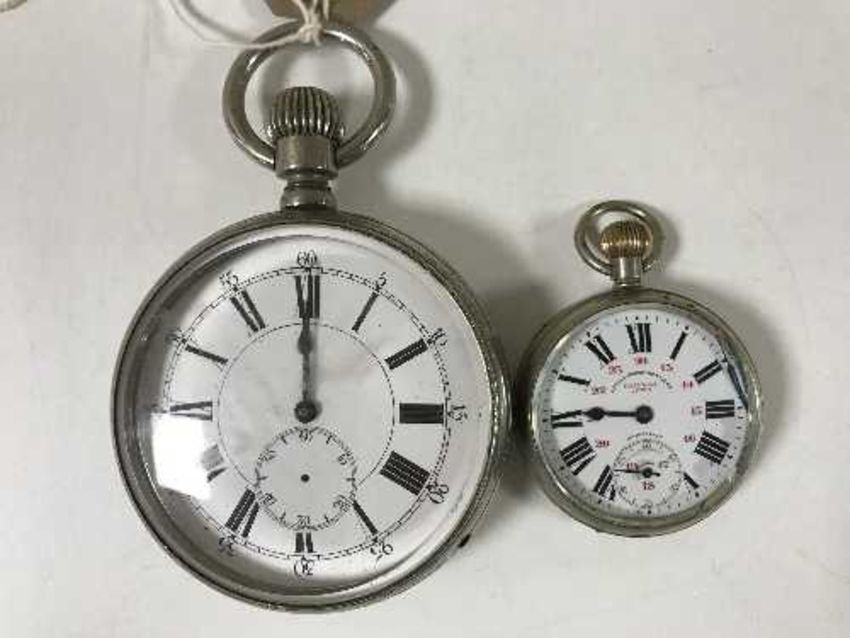 An oversized chrome plated pocket watch, face diameter 7cm with a chrome railway lever pocket watch
