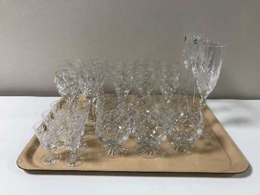 A tray containing assorted lead crystal drinking glasses including a pair of Edinburgh crystal champagne flutes