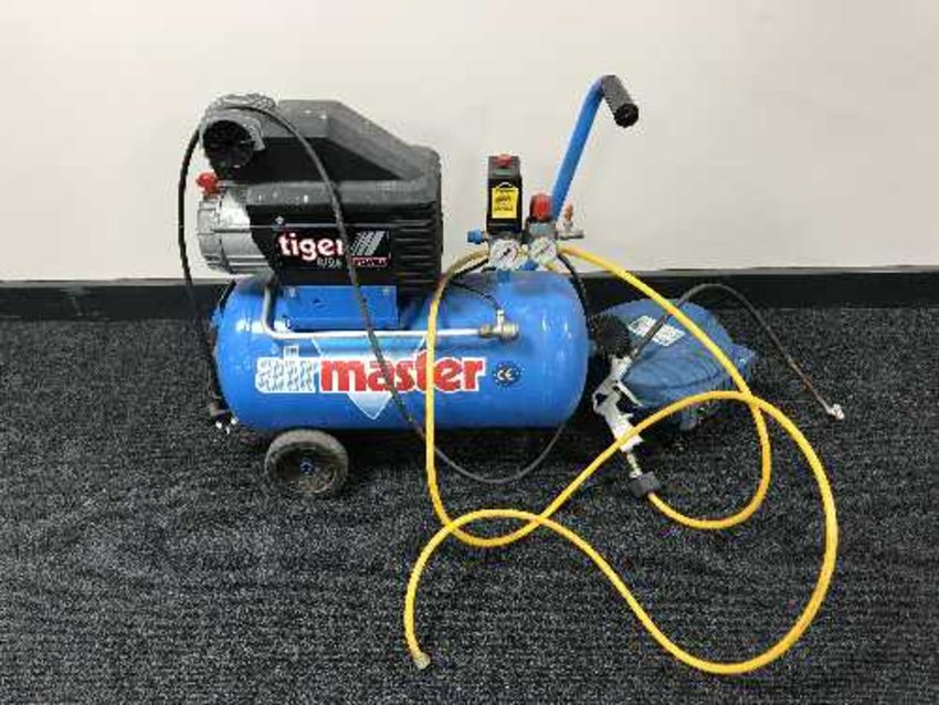 An Air Master compressor together with a Work zone air hose reel