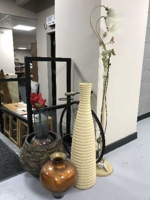 A metal standard lamp with glass shades, metal plant holder, penny farthing, thee vases and a planter