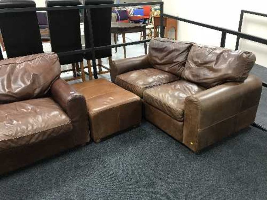 Two brown leather settees and a brown leather footstool (odd)