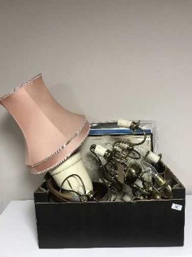 A box of two continental brass light fittings, copper coal bucket, table lamp, framed map of Durham and a folio of un-framed sketches and watercolours