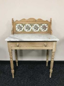 A stripped pine marble topped wash stand with tiled splash back
