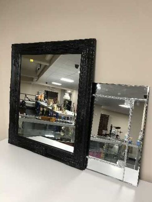A black framed mirror together with a frameless mirror, unframed canvas, shoreline scene, New York print