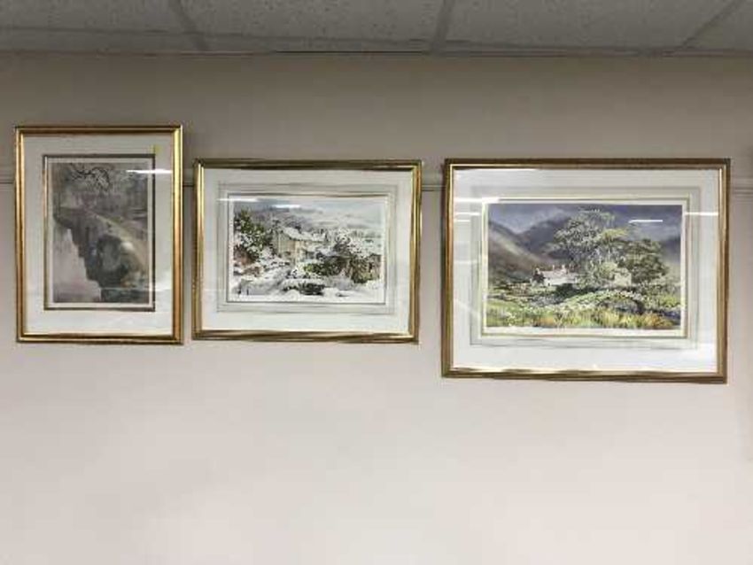 Two gilt framed signed Judy Boyes limited edition prints - Betty Cottage and The Packhorse Bridge and a A. Heaton Cooper print (3)