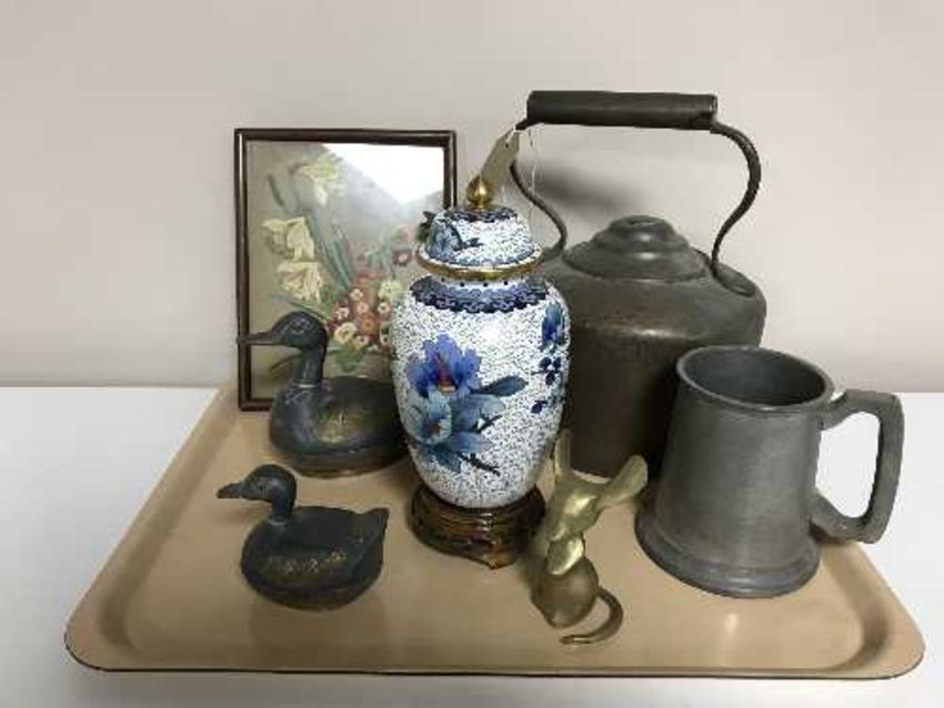 A tray of cloisonne lidded vase, copper kettle, pewter and brass duck ornaments, mahogany framed needlework panel