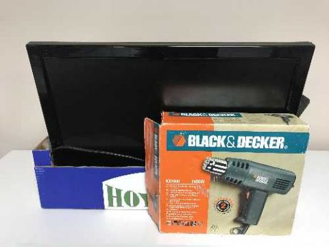 A box of two LCD TV with remotes, Black & Decker heat gun, glue gun etc
