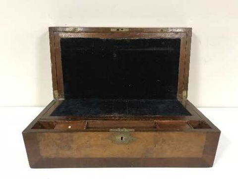 A walnut and mahogany writing box with brass inlay