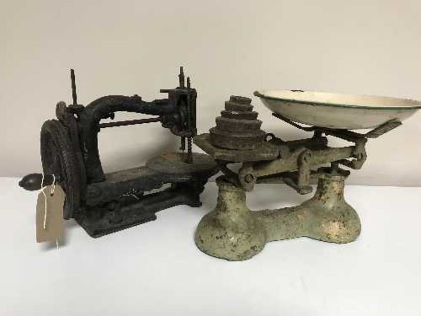 An early 20th century had sewing machine, vintage kitchen scales and weights, horse brasses