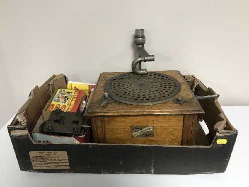 A box of table top oak gramophone and photographic outfit kit