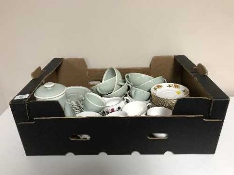 A box of two part Queen Anne bone china tea sets and a Danish Corinna tea service