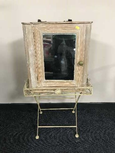 A pine mirror door wall cabinet, small wall shelf and metal folding conservatory table