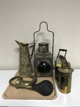 A tray of brass car horn, two brass miner's lamps, brass embossed jug and railway lamp