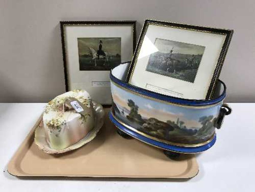 A tray of early 20th century planter, butter dish and cover and various four colour prints