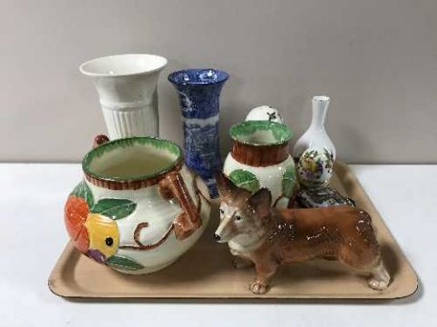 A tray containing two Crown Ducal Valencia vases, Wedgwood vase, blue and white vase, antique perfume bottles, trinket box etc