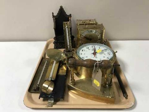 A tray of small brass propeller, brass ship's style clock, mantel clock, thermometers, etc