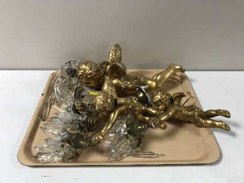 Three gilt cherub lights with glass drops