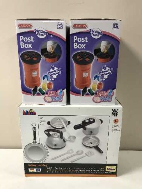 Four boxed Bosch coffee machine play seys, two Kline pan sets, five Casdon post boxes and Casdon Morphy Richards toasters