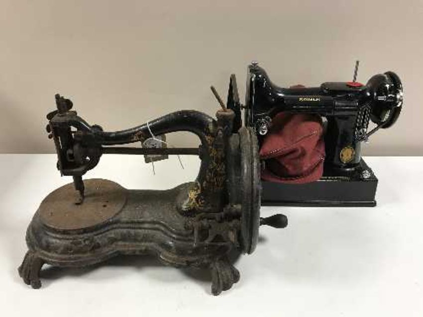 An antique hand sewing machine and a Singer electric sewing machine
