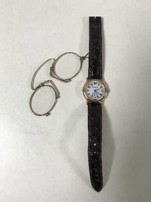 A wristwatch by Margaret Howell on leather strap together with a pair of early spectacles