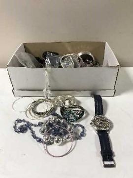 A quantity of lady's costume jewellery including wristwatches, bangles etc, together with a miniature leather cased HIT camera