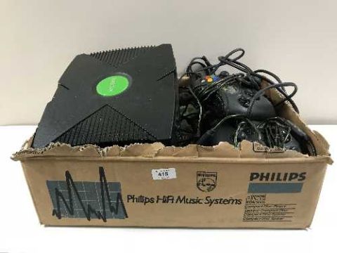 A box of two Xbox games consoles with lead and controllers