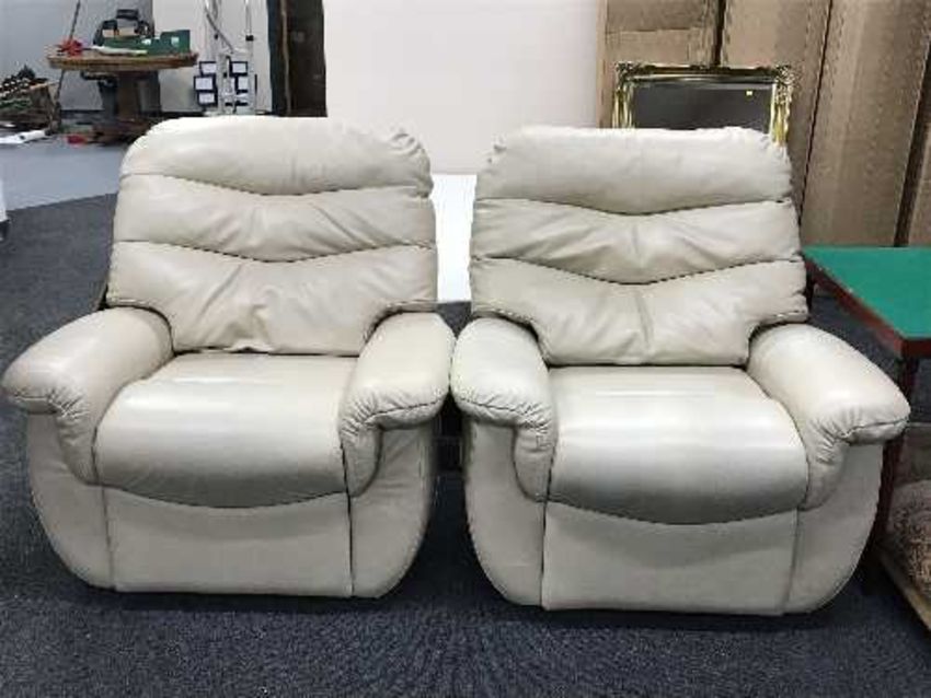 A pair of cream leather armchairs