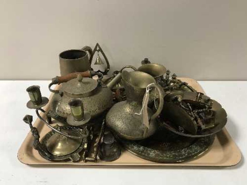 A tray containing a quantity of brassware including hand bells, miniature candlesticks, teapot etc