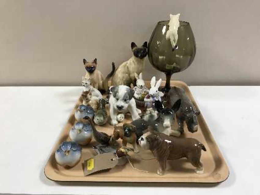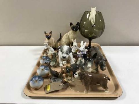 A tray containing china animal figures including a Beswick Peter Scott duck, Sylvac bulldog, continental bird figures etc