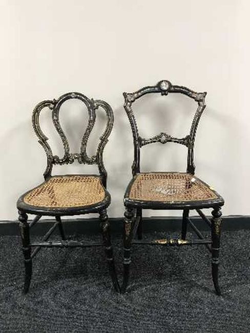 Two cane seated ebonised bedroom chairs with mother of pearl inlay