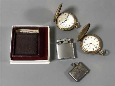 A silver vesta case, two gold plated pocket watches and two Ronson lighters (5)