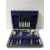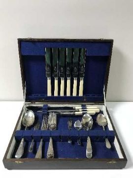 An oak part canteen of cutlery together with a plated tray containing plated tankard and jug, brass candlesticks, dominoes etc