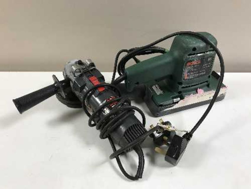 A box of assorted power tools, security lights, gas lamp etc