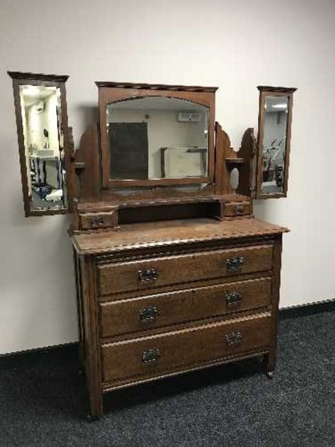 A late Victorian oak mirror door wardrobe and dressing chest with triple mirror