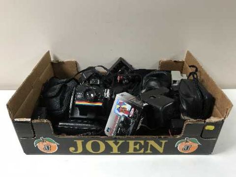 A box containing a quantity of assorted cameras including Samsung, Polaroid, Nikai, together with camera accessories