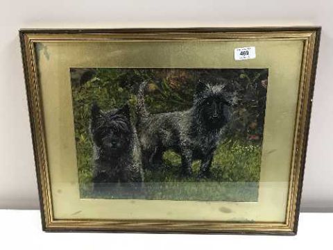 A gilt framed oil - two terriers and a D. Sherrin print - evening after rain