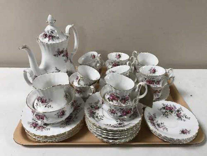 A tray containing a thirty-six piece Royal Albert Lavender Rose tea service