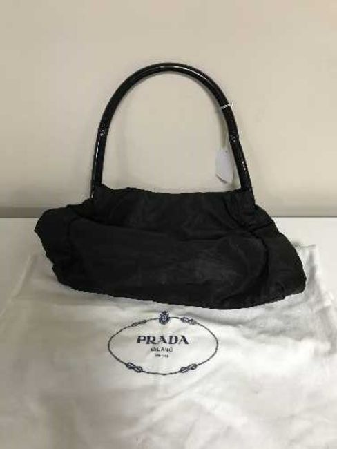 A Prada black nylon handbag, with sectional round plastic handle, 28 cm wide, 25 cm high together with Prada dust bag