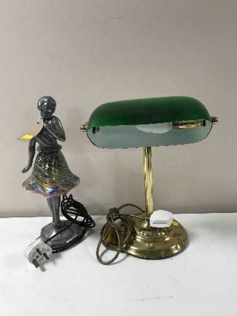 A brass companion set together with a banker's desk lamp and a metal Art Deco style table lamp