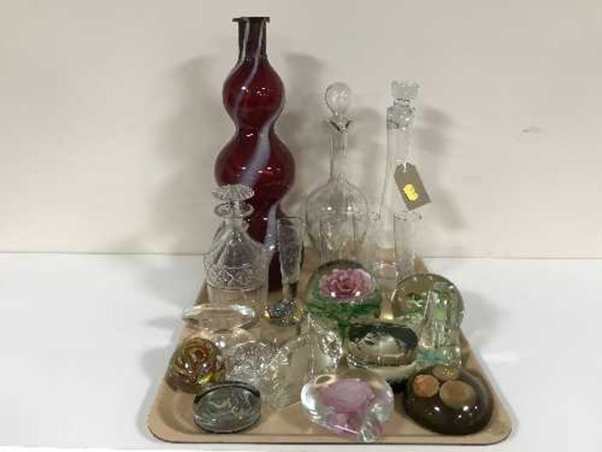 A tray of glass decanters, liqueur glasses, red bulbous glass vase, paperweights etc