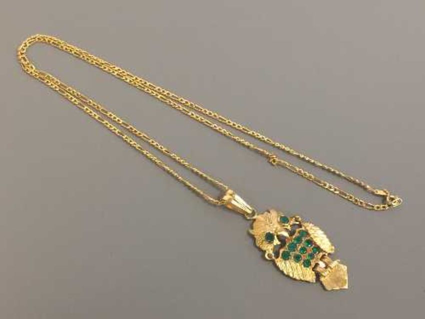 18 ct owl pendant set with emerald and chain. 12.8grams