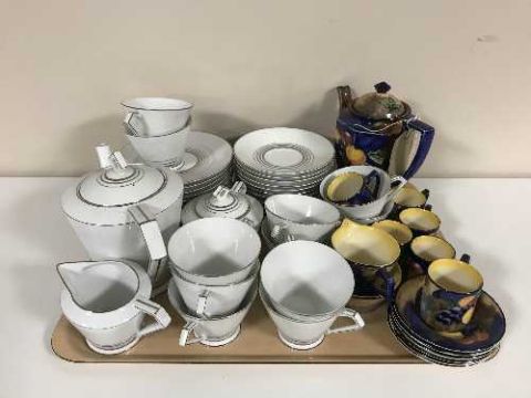 A tray of Tunstall pottery coffee service and a white & silver tea set