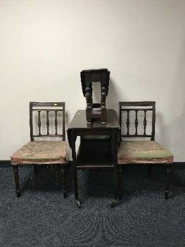 An antique oak drop leaf coffee table, two tier trolley and a pair of dining chairs