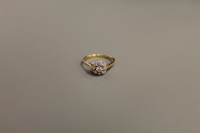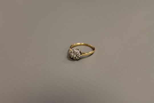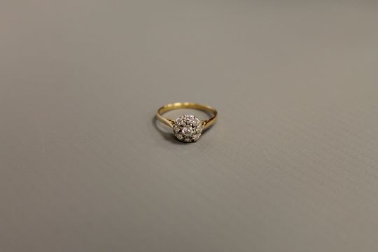 The ring is in good condition. It is stamped 18ct but the hallmark is rather worn. The central brilliant cut stone is approximately 3mm in diameter. The eight outer stones are approximately 1.2mm in diameter. 1.7g.
