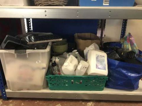 A large quantity of commercial washing liquids and cleaners - dishes and bowls, crate of menu stands, bag of frying baskets, grater, platters etc