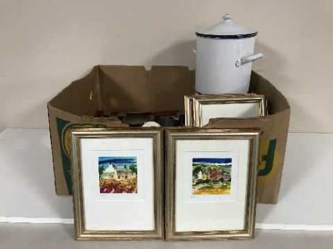 Two boxes of assorted pottery jugs, globe, enamelled urn, chess board, pictures etc